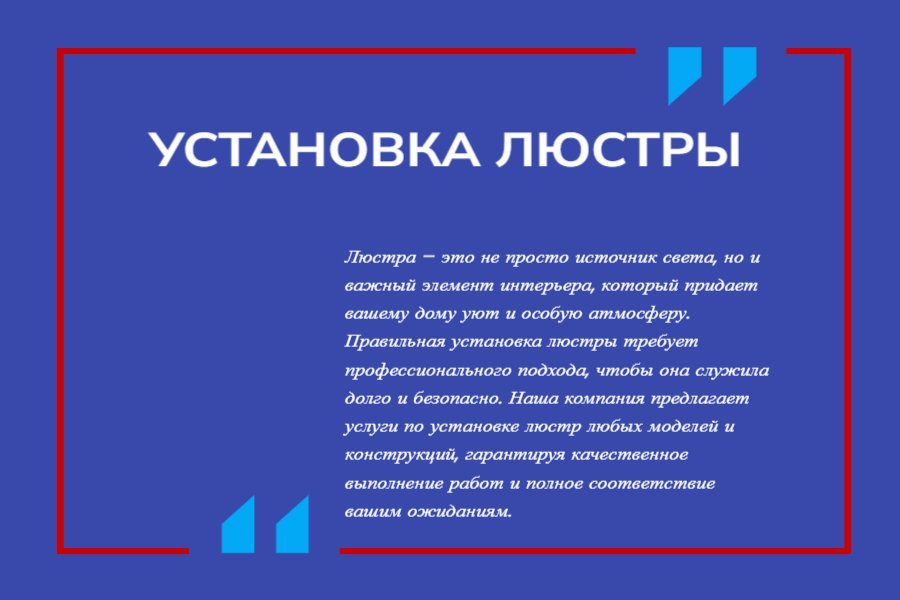 4. Гарантия на выполненные работы. Мы уверены в качестве наших услуг и предоставляем гарантию на все виды работ. Если в течение гарантийного срока возникнут какие-либо проблемы с установленной люстрой, мы оперативно устраним их без дополнительных затрат для вас.