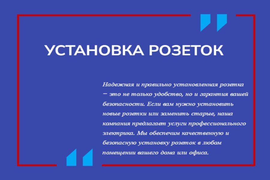 - Высокие стандарты качества. Мы используем только проверенные материалы и современные инструменты, что обеспечивает долгий срок службы установленных розеток. Все работы проводятся в строгом соответствии с действующими нормами и правилами электробезопасности.