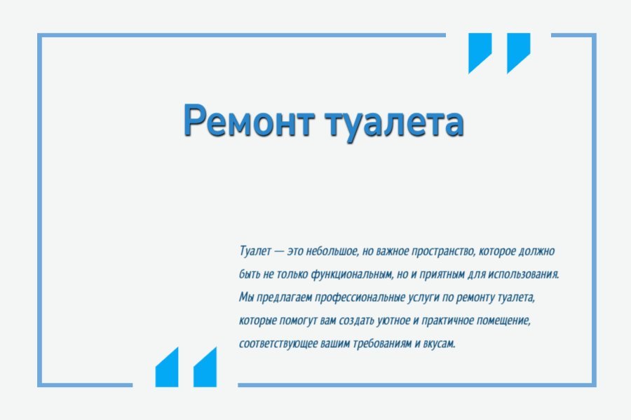 - Опыт и профессионализм: Мы имеем большой опыт в ремонте туалетов и гарантируем высокое качество работ.
